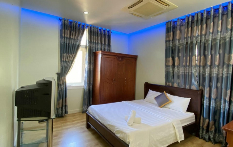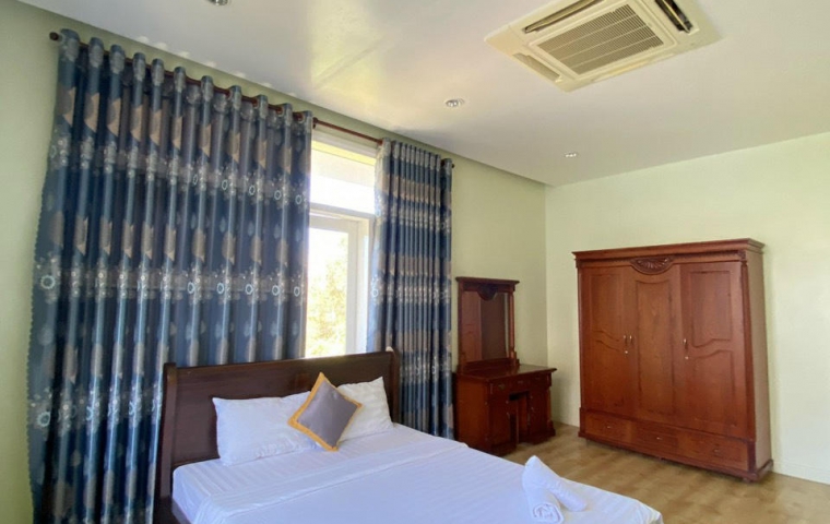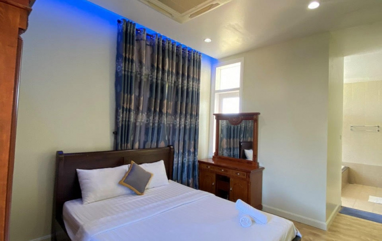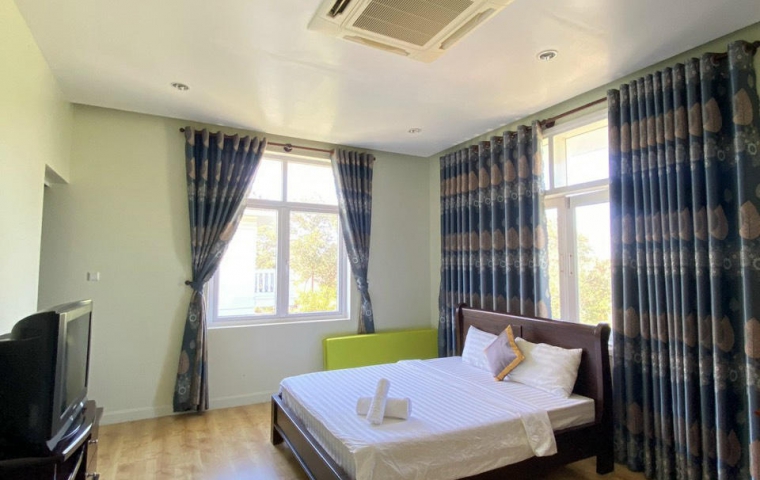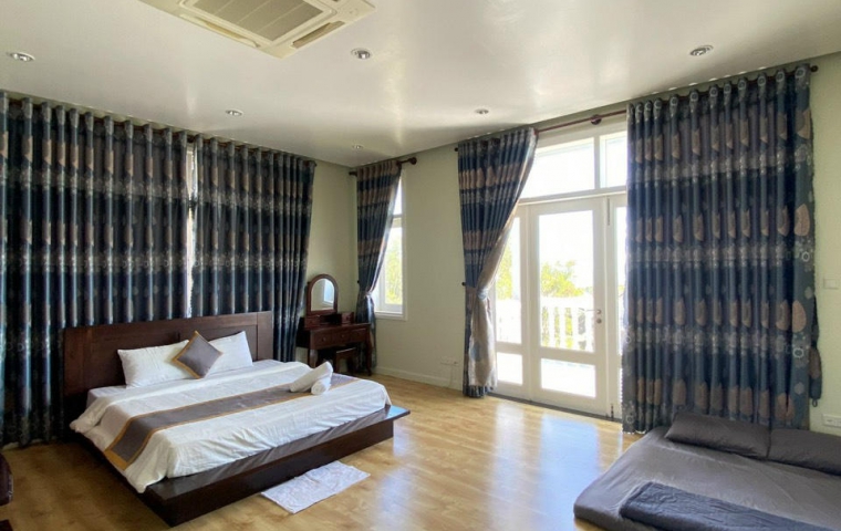 Phòng Ngủ Tiện Nghi: Với ba phòng ngủ rộng rãi, villa cung cấp không gian riêng tư thoải mái cho bạn và gia đình. Mỗi phòng đều được trang bị giường nệm cao cấp, điều hòa, và các thiết bị cần thiết, giúp bạn có những giấc ngủ ngon và phục hồi năng lượng cho những ngày khám phá. Phòng ngủ chính có cửa sổ lớn nhìn ra khu vườn xanh tươi, mang đến cảm giác gần gũi với thiên nhiên.