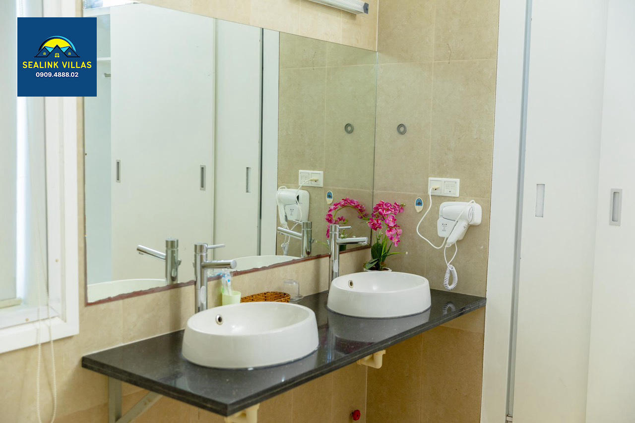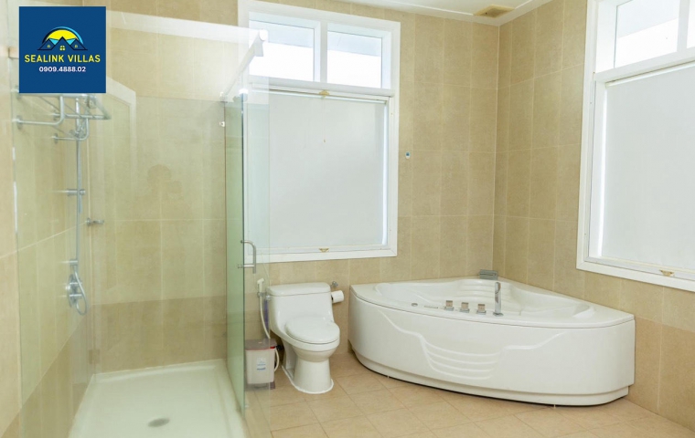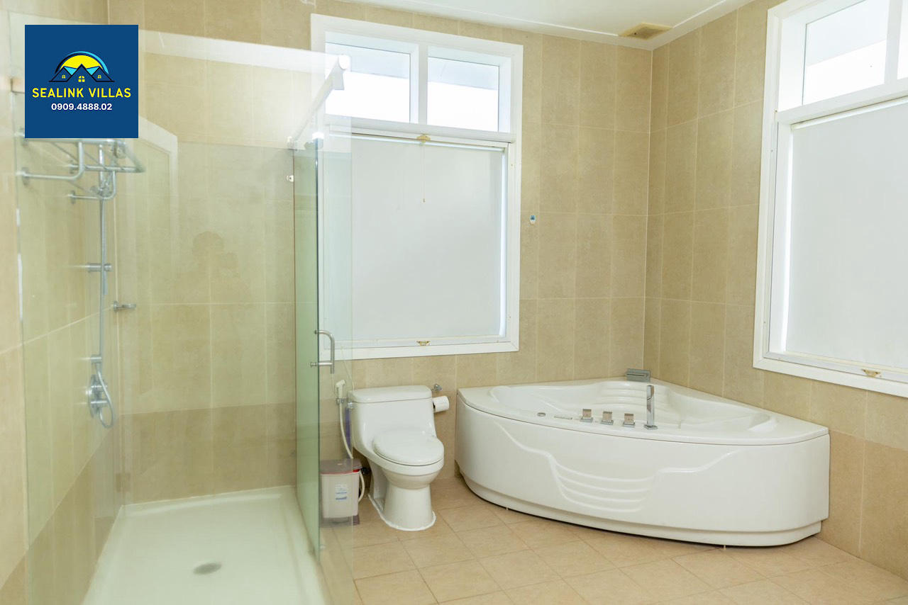 Villa PE99 được trang bị 3 phòng tắm tiện nghi, trong đó có một phòng tắm đặc biệt với bồn tắm nằm. Đây là một điểm cộng lớn, giúp du khách dễ dàng làm sạch và thư giãn sau những giờ phút vui chơi dưới biển. Các phòng tắm khác có bồn tắm đứng được thiết kế hiện đại, đáp ứng nhu cầu sử dụng hàng ngày của gia đình. Với sự bố trí hợp lý, mọi thành viên trong gia đình sẽ không phải chờ đợi lâu khi sử dụng phòng tắm, giúp bạn có thêm thời gian để tận hưởng những khoảnh khắc quý giá bên nhau.