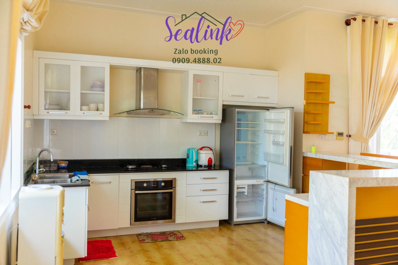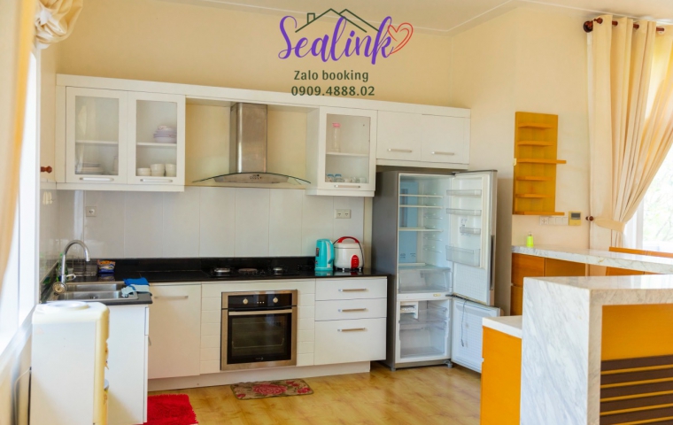 Trong căn có đầy đủ dụng cụ bếp núc như: nồi cơm điện, ấm đun nước, lò vi sóng, tủ lạnh, máy giặt, máy sấy tóc, chén đũa muỗng đầy đủ. Có cả bếp nướng điện và lò nướng BBQ cho quý khách thoải mái nấu ăn. Tuy nhiên khi nấu ăn quý khách lưu ý chuẩn bị các phần mềm như gia vị và than nướng. Và khi dùng bữa xong quý khách vui lòng rửa chén, nếu để lại chén dĩa chưa rửa, đội ngũ vệ sinh sẽ phụ thu 200.000 - 500.000đ/trường hợp. Trong khu có hồ bơi, sân golf, tennis quý khách cần sử dụng sẽ tự mua vé sử dụng dịch vụ. Vé hồ bơi: 150.000đ/lớn, 100.000đ/bé. (Dưới 1m3 tính bé)