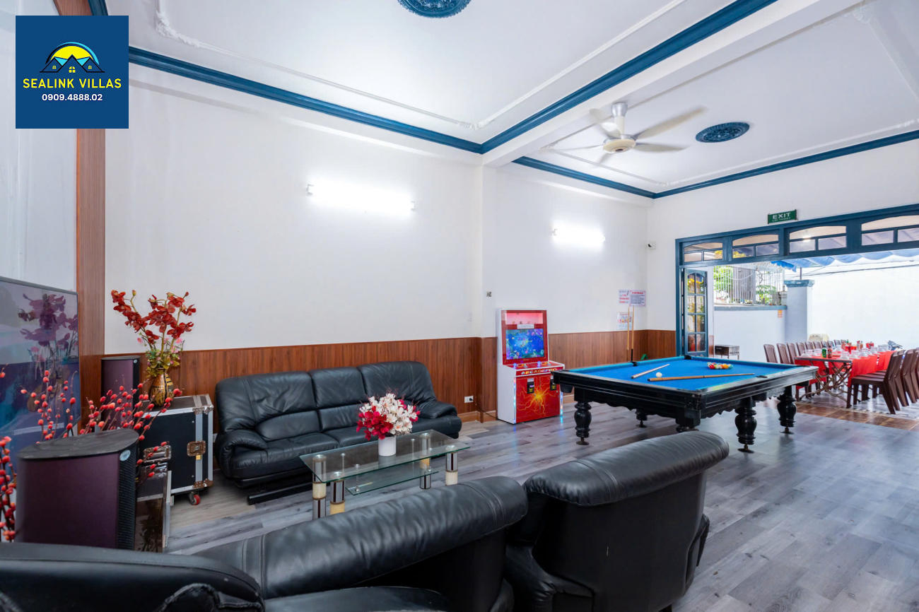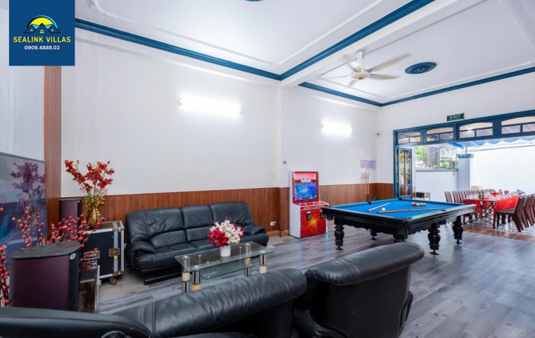 Tại đây cả gia đình có thể quay quần không gian phòng khách. Vừa có thể karaoke, nhóm khác lại có thể tranh thủ thư giãn với bàn bida.