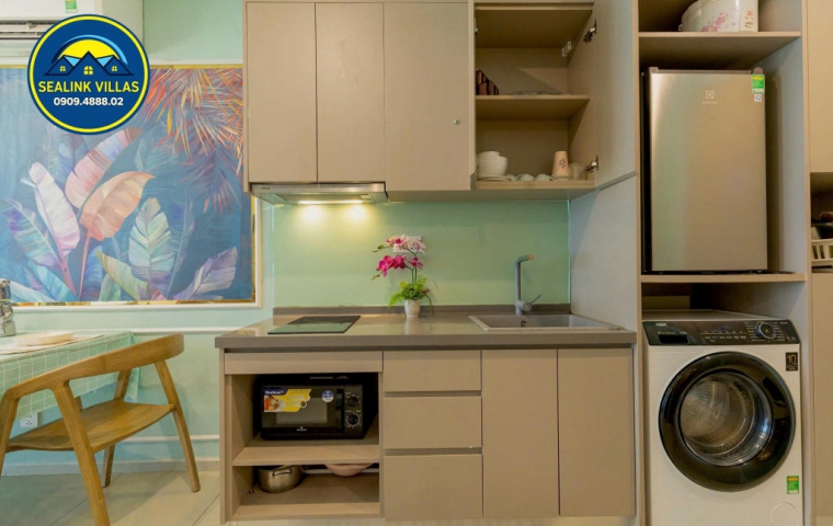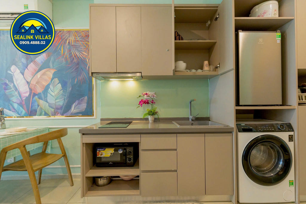 - Phòng khách và bếp: Căn hộ được trang bị máy lạnh, tivi và đầy đủ các dụng cụ nhà bếp cùng gia vị cơ bản, giúp bạn dễ dàng chuẩn bị bữa ăn tại nhà.