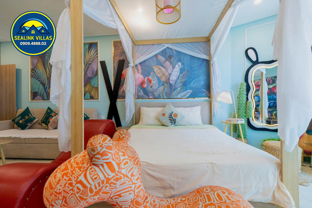 - Phòng ngủ: Căn hộ có 1 giường lớn (1m6x2m) và 1 sofa bed thoải mái, phù hợp cho các cặp đôi hoặc gia đình nhỏ.