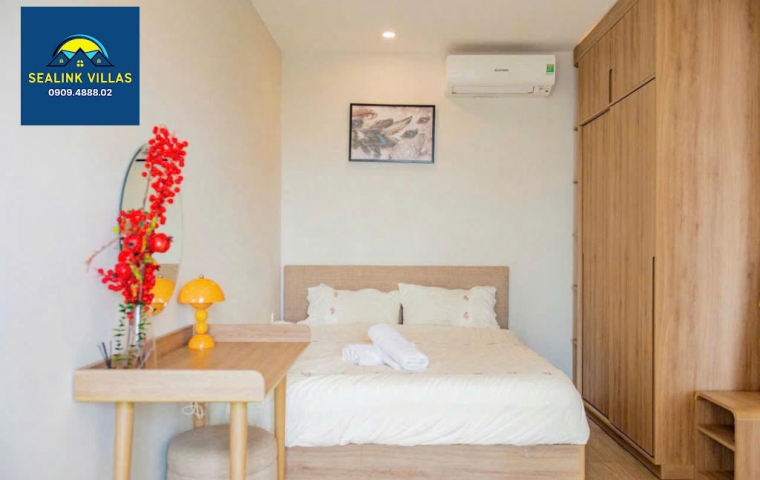 Không gian nhỏ nhưng đủ đầy – máy lạnh mát lạnh, tủ quần áo gọn gàng, ánh sáng ấm dịu, tất cả kết hợp để mang đến những giấc ngủ trọn vẹn giữa nhịp sống yên bình của biển.