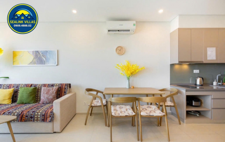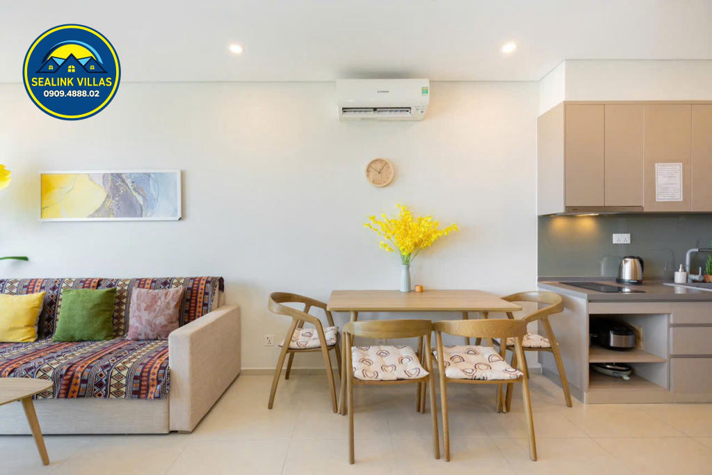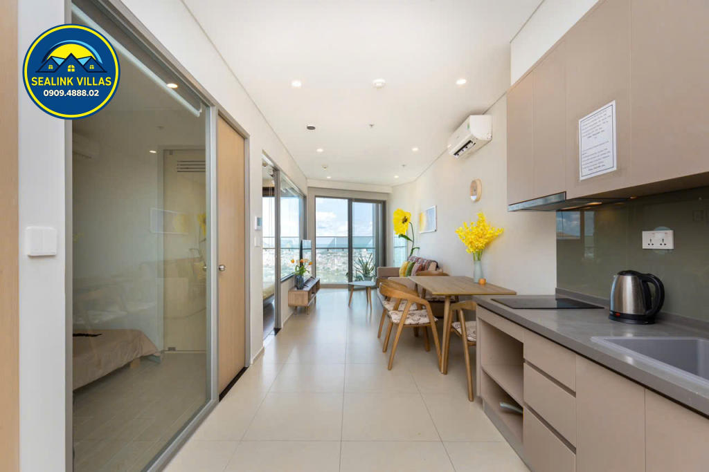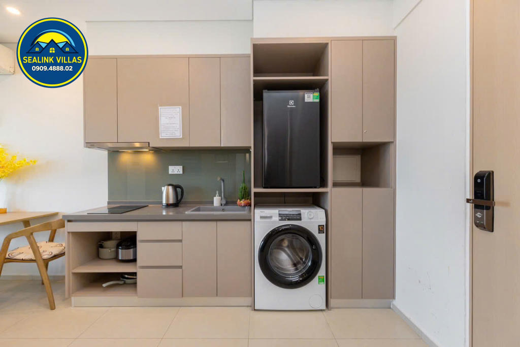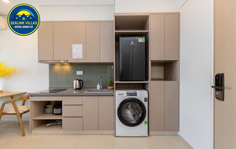 Điểm nổi bật là căn hộ này có bếp hiện đại, được trang bị đầy đủ các dụng cụ nấu ăn, giúp bạn có thể thỏa sức chế biến các món ăn yêu thích cho gia đình. Sau một ngày vui chơi, không gì tuyệt hơn là ngồi lại bên nhau, cùng thưởng thức bữa cơm nhà, phải không nào?