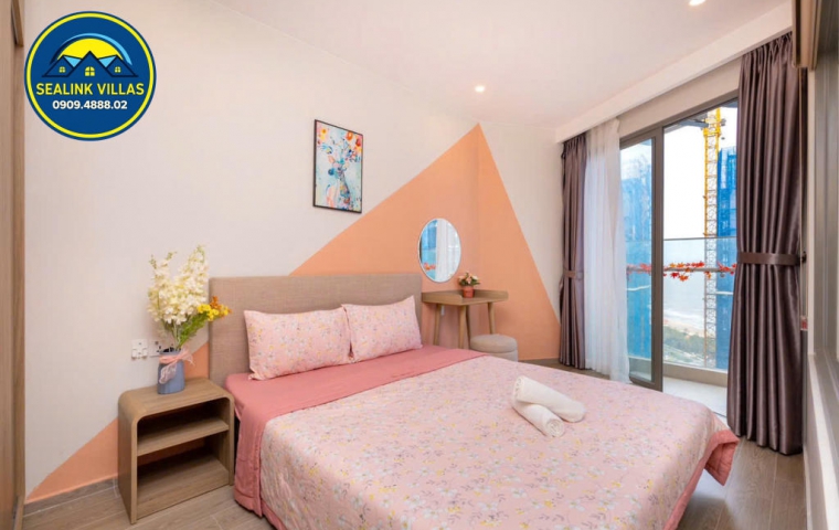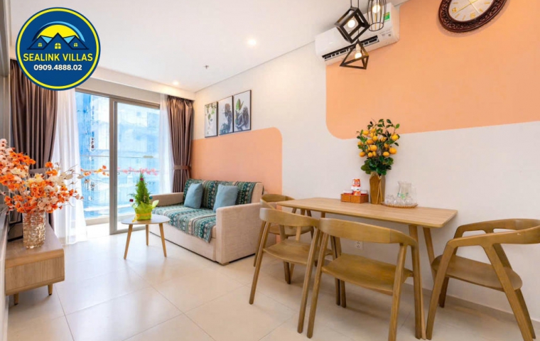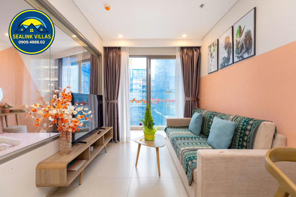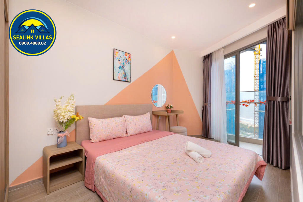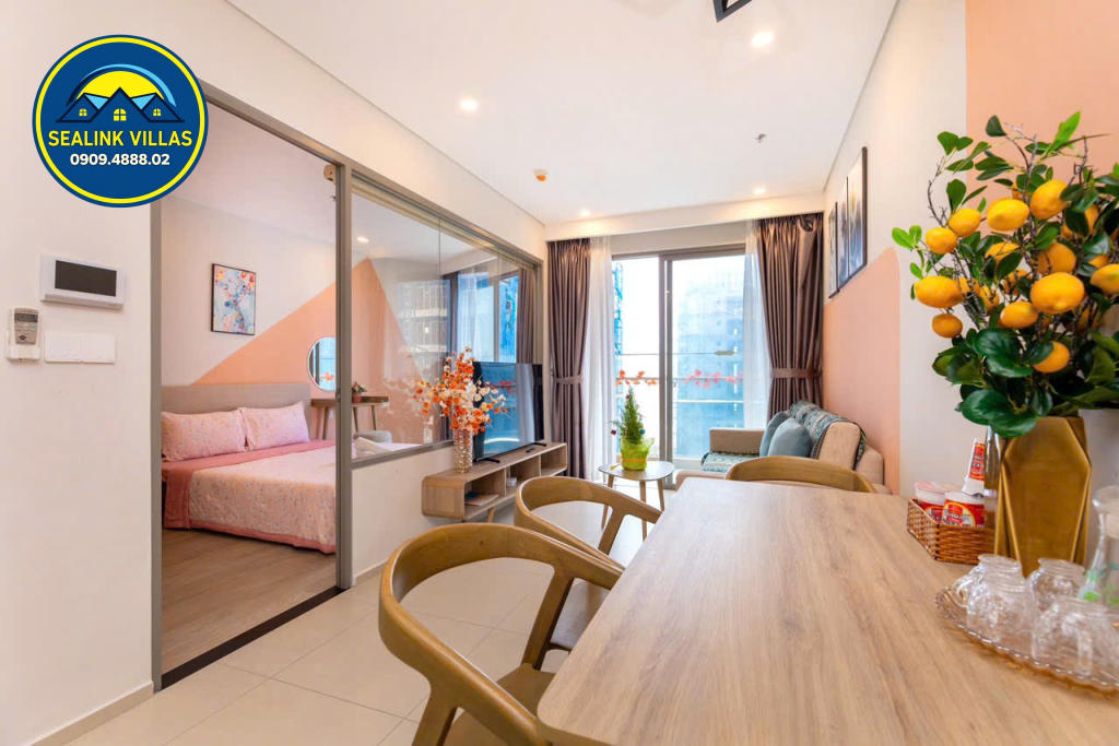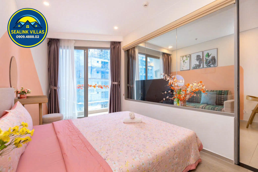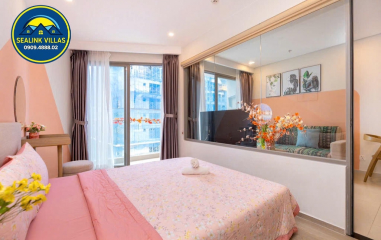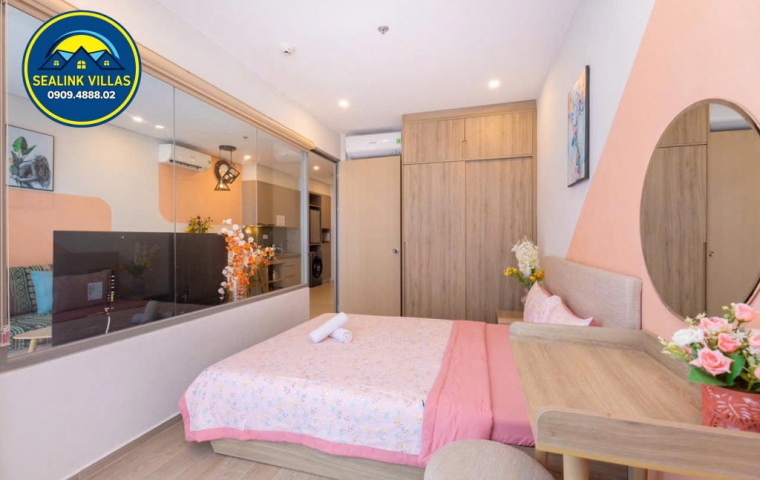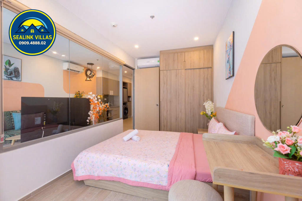 Căn hộ được thiết kế với nội thất hiện đại, tinh tế và sang trọng, với tông màu hồng chủ đạo, mang đến sự tươi mới và trẻ trung. Không gian bên trong căn hộ luôn được giữ sạch sẽ và gọn gàng, đảm bảo đem lại cảm giác thoải mái, an toàn cho mọi quý khách trong suốt thời gian lưu trú.