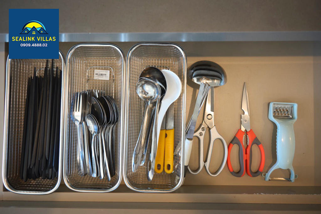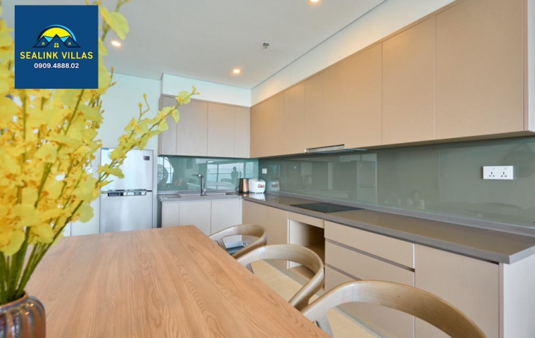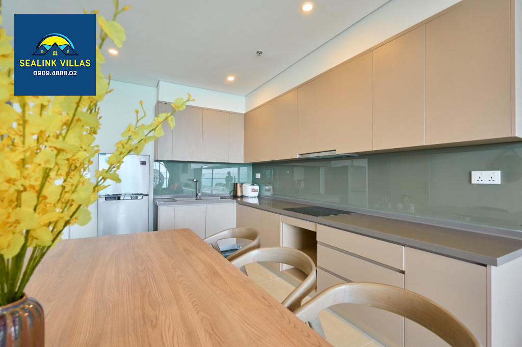 Không cầu kỳ như villa, bếp tại The Sóng Vũng Tàu 7.26 được thiết kế nhỏ gọn nhưng đủ đầy. Có sẵn bếp từ, tủ lạnh, nồi nhỏ, chén đĩa và ấm siêu tốc – phù hợp cho việc nấu ăn đơn giản, pha trà, hay chuẩn bị bữa sáng nhẹ nhàng.