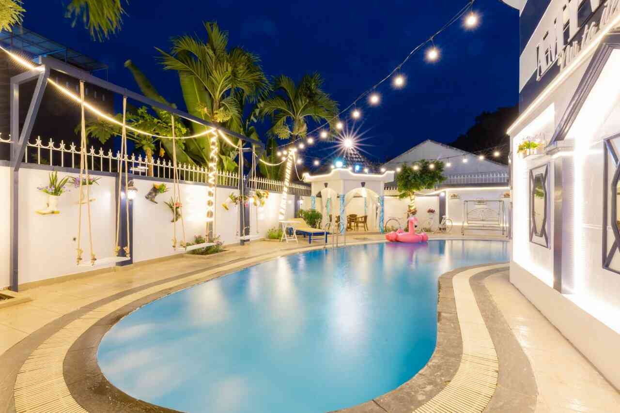 Điểm nổi bật khác của villa chính là hồ bơi rộng 100m2, nơi bạn có thể thoải mái bơi lội và thư giãn dưới ánh nắng mặt trời. Với thiết kế thoáng đãng và không gian xanh xung quanh, villa mang đến một cảm giác gần gũi với thiên nhiên. Kiến trúc của villa được thiết kế theo phong cách Châu Âu cổ điển, tạo nên một không gian nghỉ dưỡng sang trọng nhưng cũng không kém phần ấm cúng.